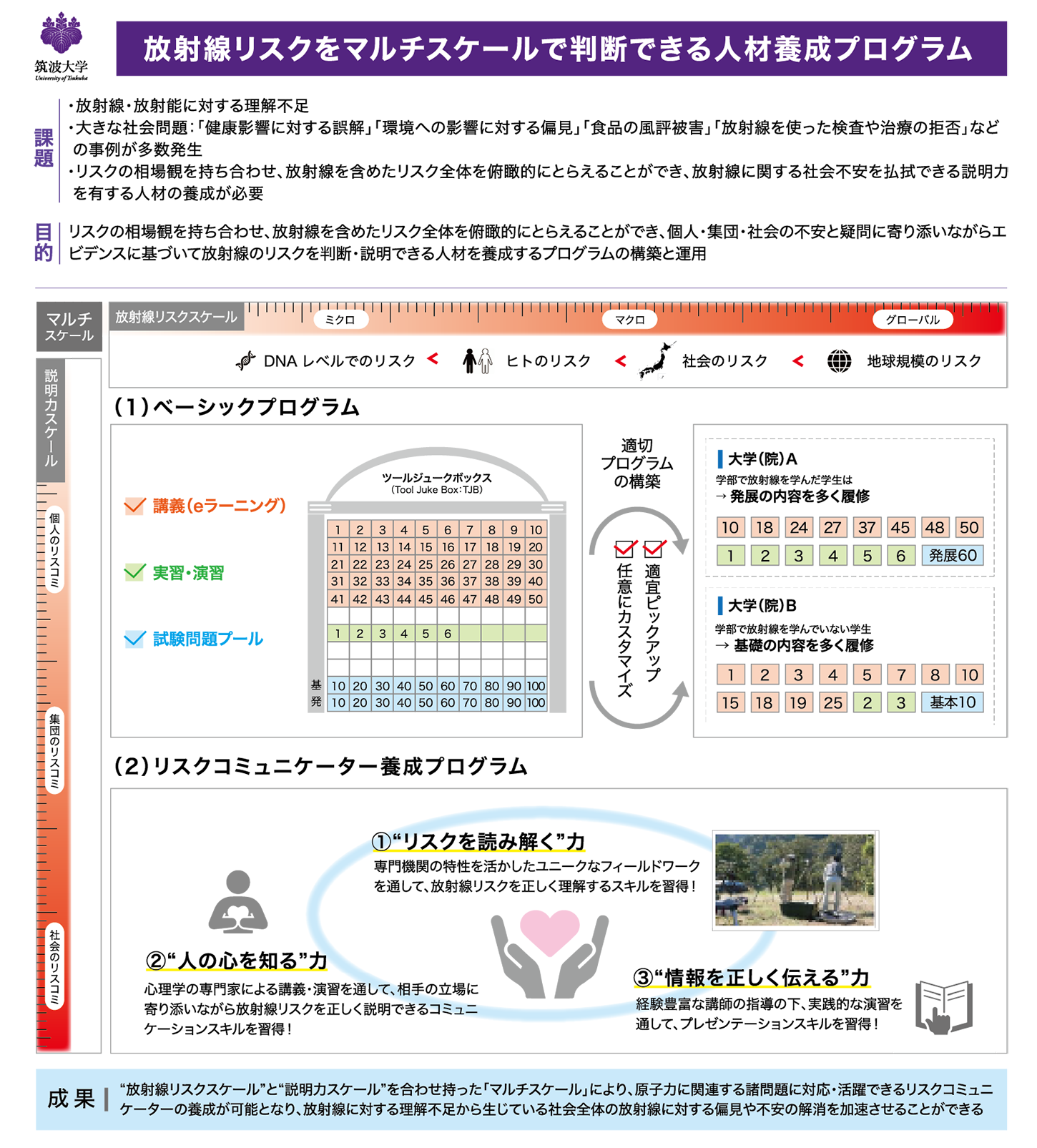 2011年3月に発生した福島第一原子力発電所事故は、多くの被害をもたらすと同時に、一般市民の「放射線リスク」に対する理解不足を浮き彫りにしました。この理解不足により、福島原発事故以降、放射線による健康や環境への影響に対する誤解や偏見、食品の風評被害、放射線検査や放射線治療の拒否などの事例が多数発生しており、大きな社会問題となっています。「放射線リスク」と一括りにしても、DNAやヒト(個人)、社会、地球規模といった段階的なリスクが存在しており、放射線リスクを適切に理解・判断するためには、リスク全体を俯瞰的に捉えることが必要になります。また、放射線に対する偏見や不安を解消するためには、相手(個人、集団、社会)の立場に寄り添いながら、エビデンスに基づいて放射線リスクを説明することも重要です。放射線に対する社会問題の解決を目指す上で、放射線リスクをDNAレベル(ミクロ)→ ヒト(マクロ)→ 社会 → 地球規模(グローバル)へと波及していくリスクとして的確に判断できる力(放射線リスクスケール)とエビデンスに基づいて説明できる力(説明力スケール)を合わせた「マルチスケール」を有する人材の育成は重要な教育課題です。
